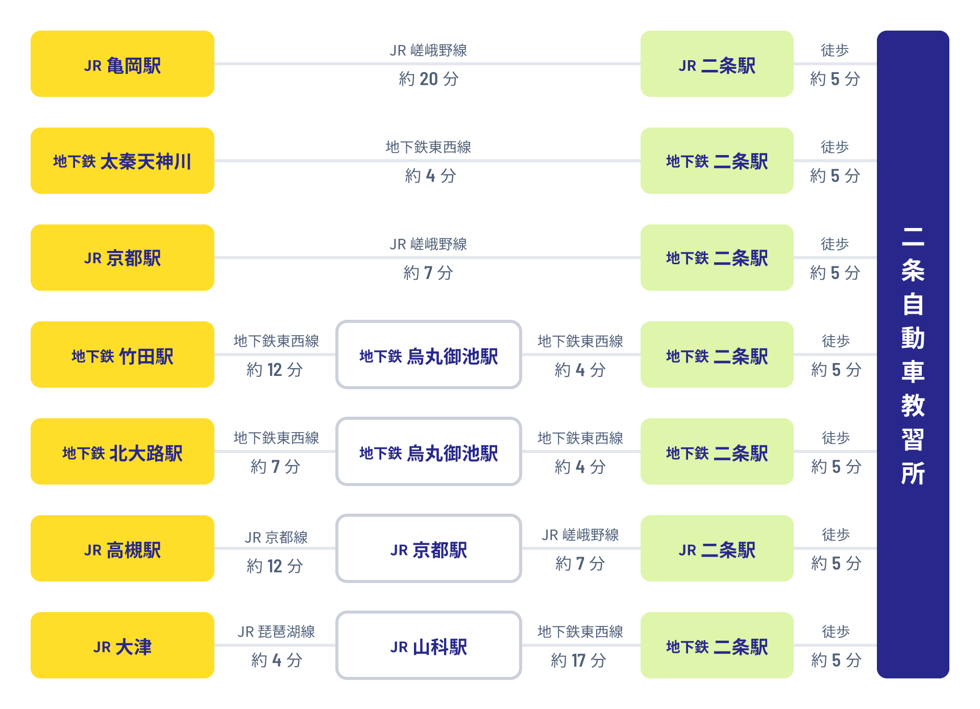 最寄り駅は JR 山陰線「二条」駅、地下鉄 東西線「二条」駅です。